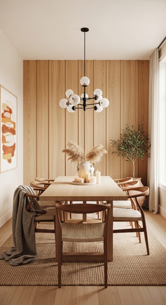 Wood paneling adds warmth and texture, making your dining room feel cozy and inviting.